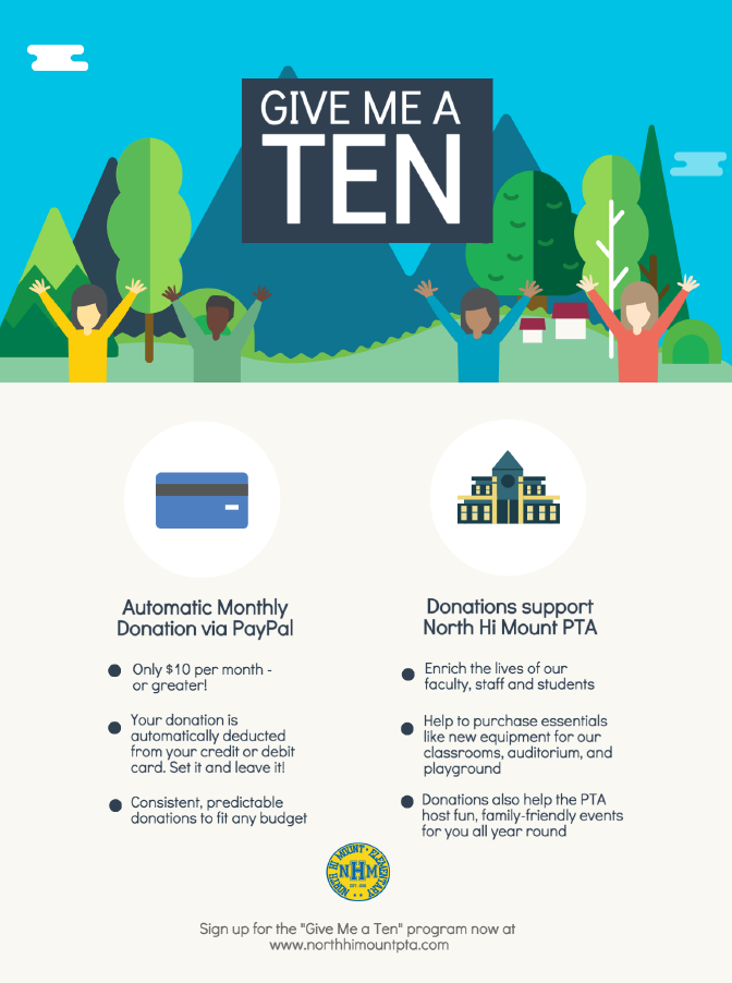 If you are looking for an easy way to give back to North Hi Mount, consider joining our Give Me a Ten program. You determine the amount you'd like to donate each month (starting at just $10!!) from your credit or debit card, and the rest is done for you. Think of it just like your Netflix subscription.